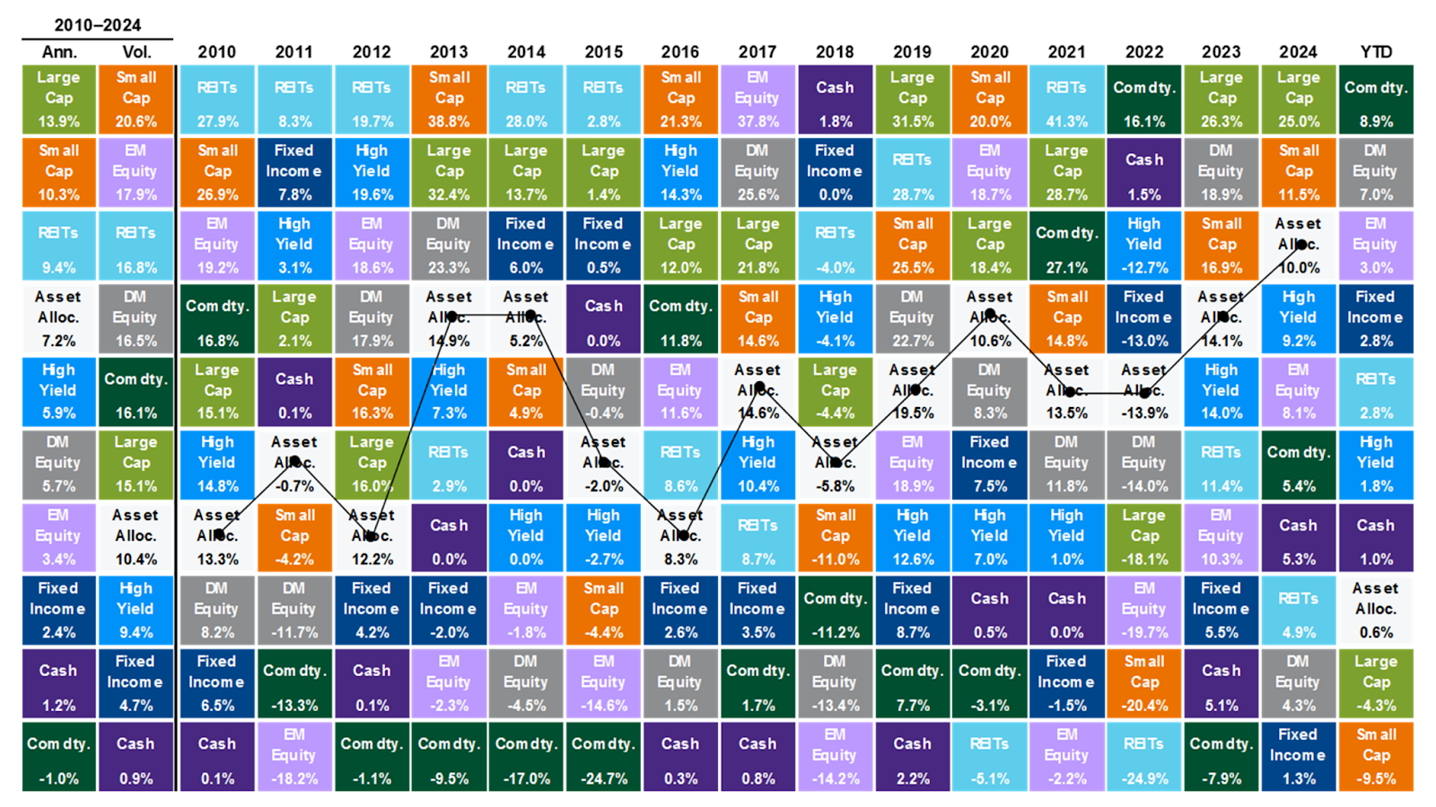 One standout visualization is the “Periodic Table of Investment Returns,” which ranks various asset classes annually by performance. Each color represents a different asset class—such as U.S. large cap stocks, REITs, commodities, or fixed income—and their relative performance changes year to year.